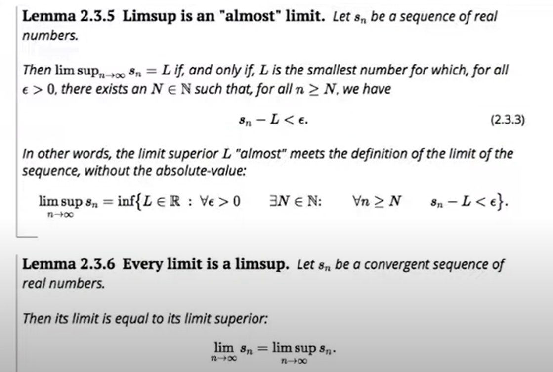 극한의 정의와 유사하나 절대값이 아니고 infimum이 존재한다. - 11/22/17 The third version of the limsup definition underscores its relationship with the limit definition: replacing the requirement that a tail of the sequence remains within an epsilon strip (abs(s_n - L) < epsilon) with the weaker condition that it does not crash through the ceiling of that strip.